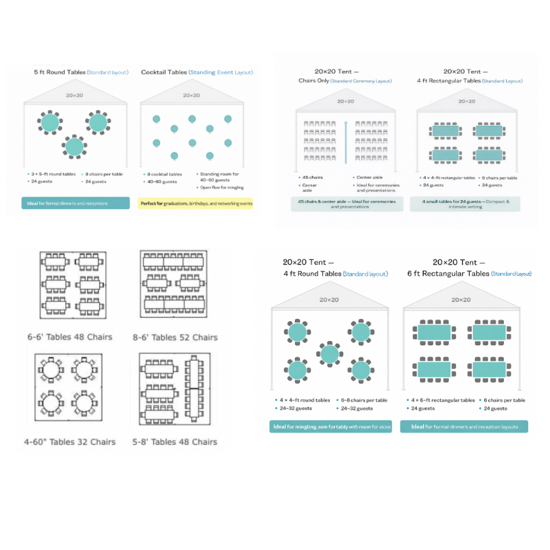 With proper layout, the 20×20 tent comfortably accommodates up to 80 guests for cocktail-style events or 30–50 guests for seated dining.