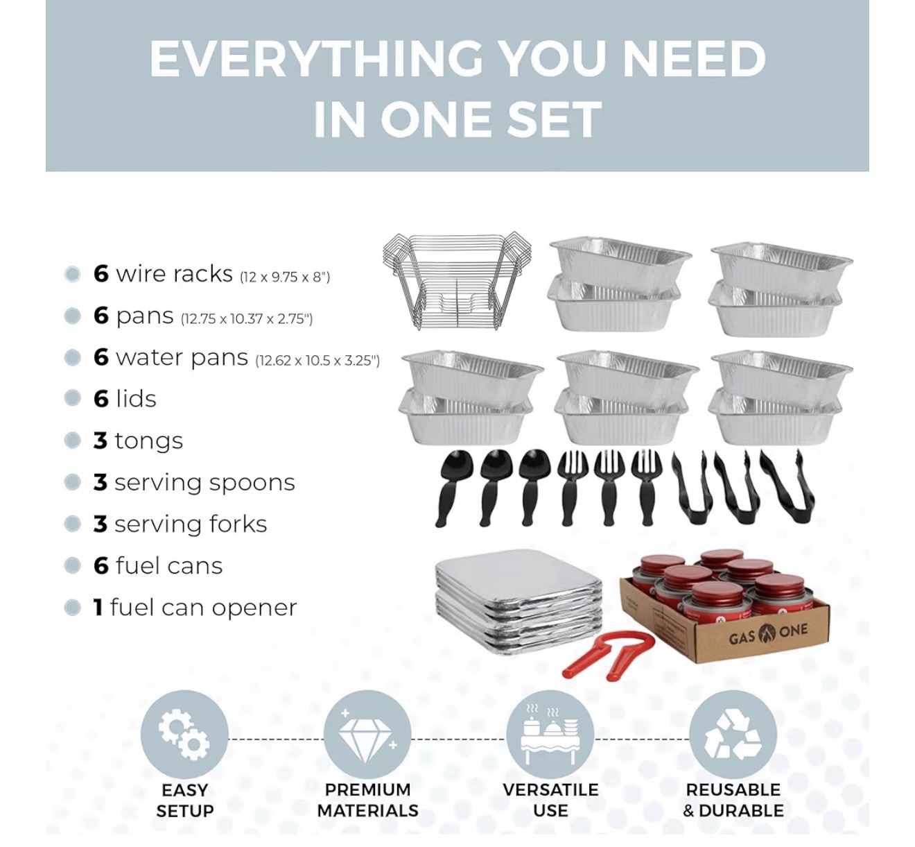 Includes 6 disposable chafing dish wire racks - Includes 6 aluminum half-size food pans (food-grade & safe) - Includes 6 fuel cans (burn time may vary) - Includes 3 sets of serving utensils - Disposable items are intended for single-event use - Setup and teardown not included unless added separately - Must be used on a stable, heat-safe surface - Open flame present – adult supervision required