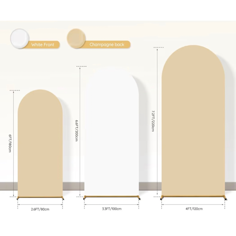 Covers only—arch stands not included unless added separately. Reversible white/beige set of 3 covers fits standard 3-piece arch stand sets. Indoor use recommended; if outdoors, secure stands with weights. Do not apply tape directly to covers. Return free of stains, wax, and heavy debris to avoid cleaning/damage fees.