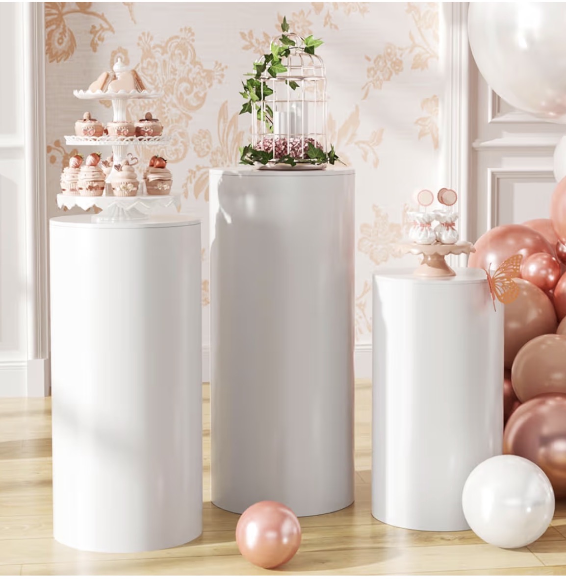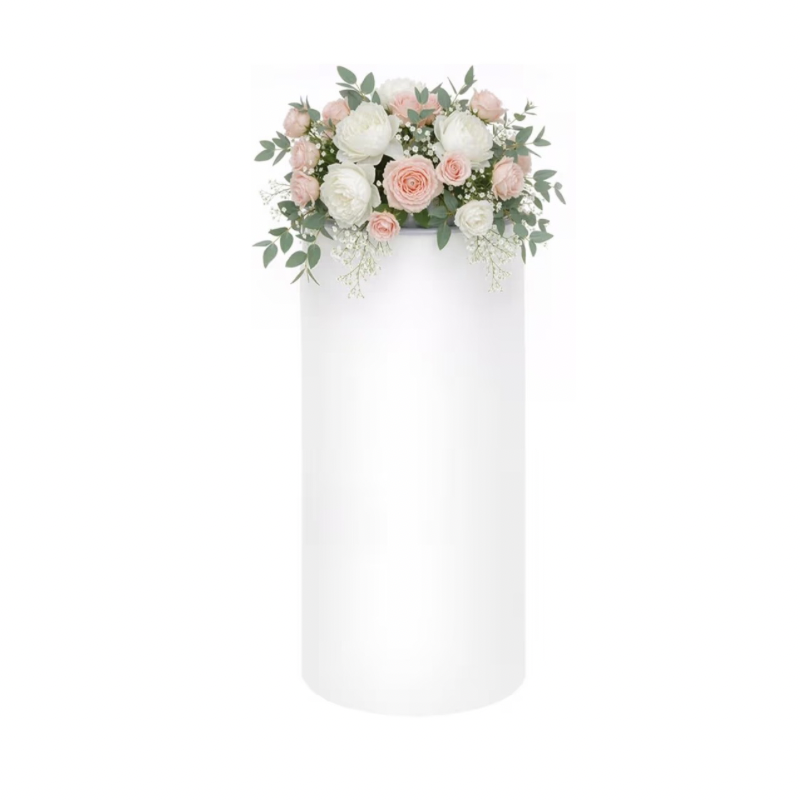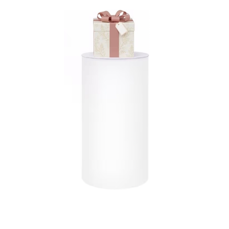 Its sleek cylindrical design and crisp white finish blend beautifully with any theme. From weddings and baby showers to birthdays and upscale events. Whether used alone or paired with multiple plinths for a layered display, this piece adds height, dimension, and sophistication to your setup.